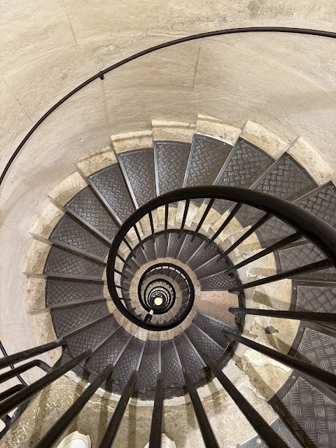 We got ready and out the door and walked to our first site on the pass, the Arc de Triomphe. There's no reservation needed, although you do have to pay for a ticket if you don't have the pass. We took the stairs to the top, stopping on the floor below the roof to learn about the monument’s various carvings and its history. At the top was a beautiful 360-degree view of Paris. We thoroughly enjoyed walking around the whole thing and looking out at all the sights we had come to recognize. We went down to the bottom and looked closely at all the art on the walls. And then, we took the Metro over to the Louvre.